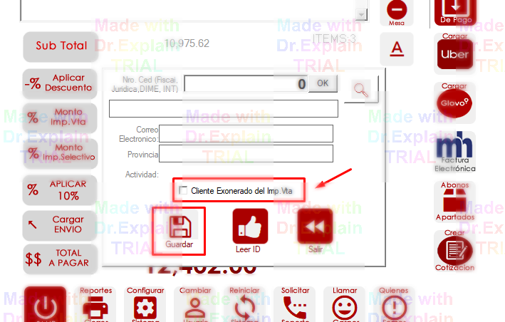 Encontrará la casilla CLIENTE EXONERADO DEL IMP.VTA, márquela para que la factura NO carque el impuesto de ventas.