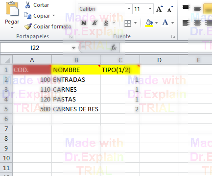 Tipo: Este es el tipo de categoría (digite 1 si es un producto de venta). O 2, si es parte de una receta.