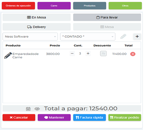 Inventarios, facturación, recetas, meseros, mesas, impuestos 10%, 13% , pedidos en línea, usuarios, ajustes, configuración, reservacion de mesas, control de proveedores.